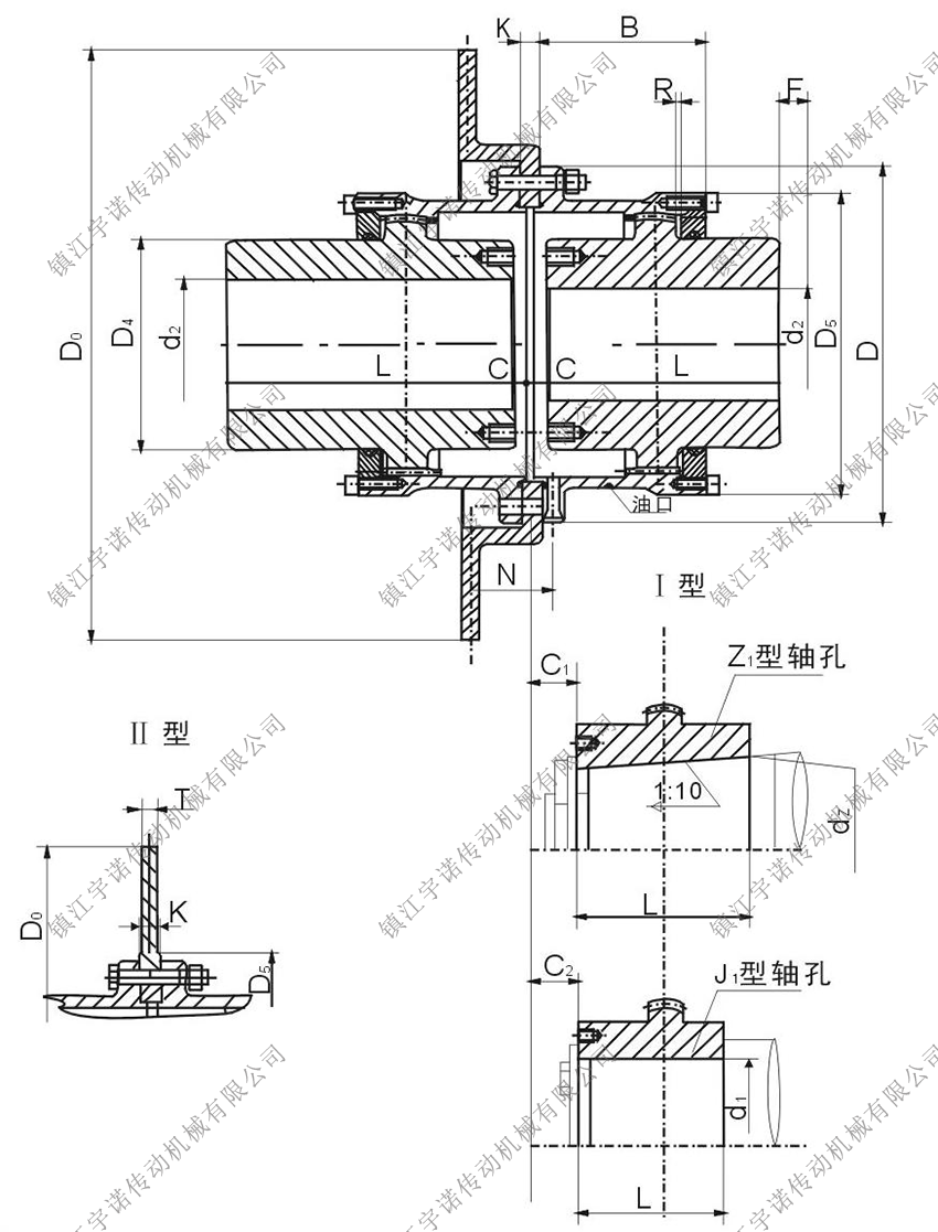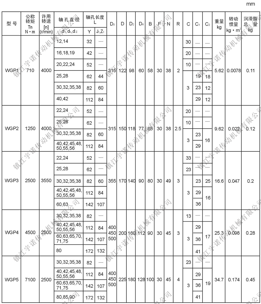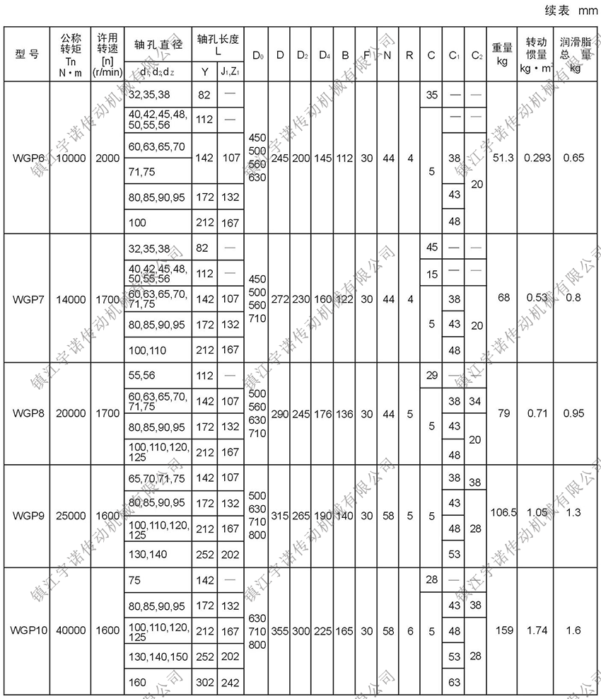 WGP型帶制動盤鼓形齒式聯(lián)軸器是由齒數(shù)相同的內(nèi)齒圈和帶外齒的凸緣半聯(lián)軸器等零件組成。外齒分為直齒和鼓形齒兩種齒形,所謂鼓形齒即為將外齒制成球面,球面中心在齒輪軸線上,齒側(cè)間隙較一般齒輪大,鼓形齒聯(lián)軸器可允許較大的角位移(相對于直齒聯(lián)軸器),可改善齒的接觸條件,提高傳遞轉(zhuǎn)矩的能力,延長使用壽命。有角位移時沿齒寬的接觸狀態(tài)。該聯(lián)軸器適用于聯(lián)接水平兩同軸線傳動軸系,制動盤直徑315-1000mm,傳遞公稱轉(zhuǎn)矩710-160000N.m。
